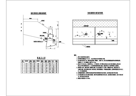 本设计包含俯斜式路肩挡土墙和俯斜式路堤挡土墙构造大样,并提供了两种形式的断面尺寸表。图纸包括:路堤矮脚墙、路堑矮挡墙、路肩、每延米工程数量表、护肩每延米工程数量表、俯斜式路肩挡土墙断面构造图、仰斜式路