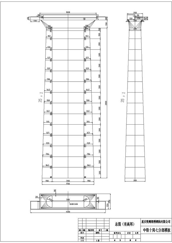 高速铁路特大桥墩模板全套图纸(附模板受力计算书),图纸包括:总图,托盘顶帽整装图,托盘俯视图,托盘端模,托盘边模,顶帽牛腿整装标志,顶帽高邦拉杆,高邦边模,牛腿底模等。