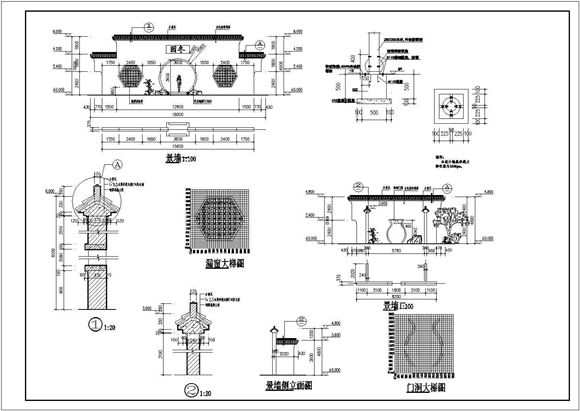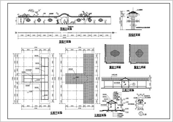 某中式长廊/景墙/围墙全套施工图,含两个中式景墙、一个中式围墙、一个中式长廊(木结构),景墙和围墙图纸含平面、立面、剖面及大样图,长廊图纸含平面图、顶面图、立面图、剖面图、坐凳详图以及详图等。