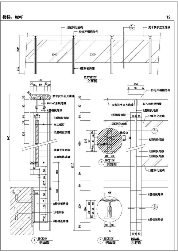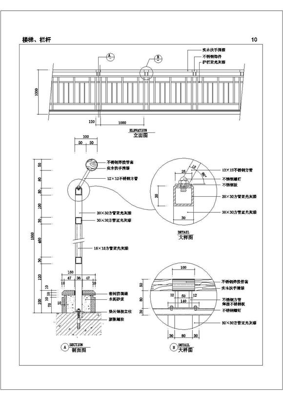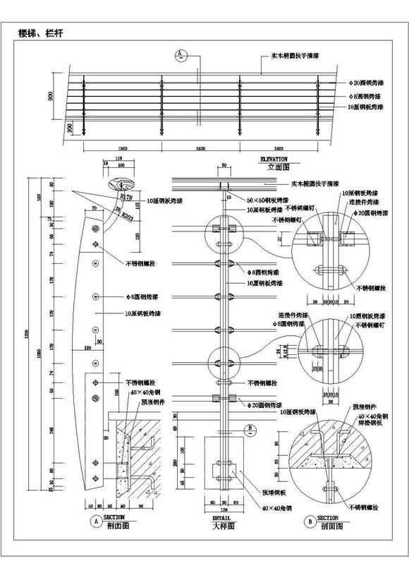 此图为多种围栏栏杆全套施工图设计,图纸包括各个栏杆的立面图、剖面图、大样图、节点详图。
