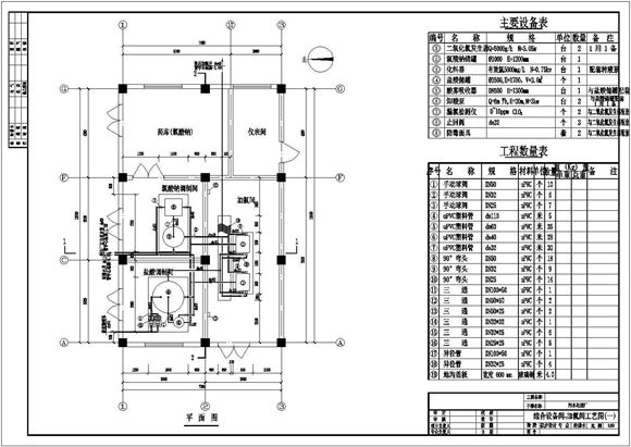 本图纸为:二氧化氯加药工艺图纸,包含加药设备间及其加药线路、配套设备参数说明、设备材料工程量清单以及配套说明。值得参考。