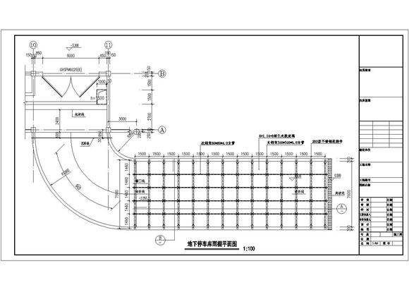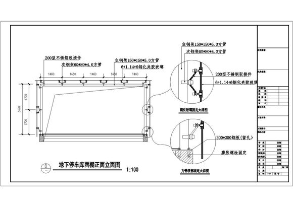 地下停车库入口钢结构玻璃顶雨棚施工图、平面、立面及连接大样。