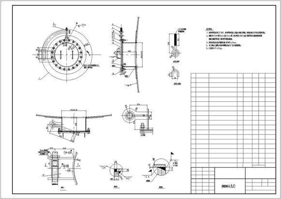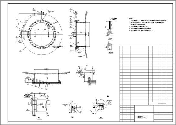 本图为人孔门DN800人孔门DN500详图,图纸内容包括:DN800和DN500人孔门装配图、零件表以及加工技术要求等等。